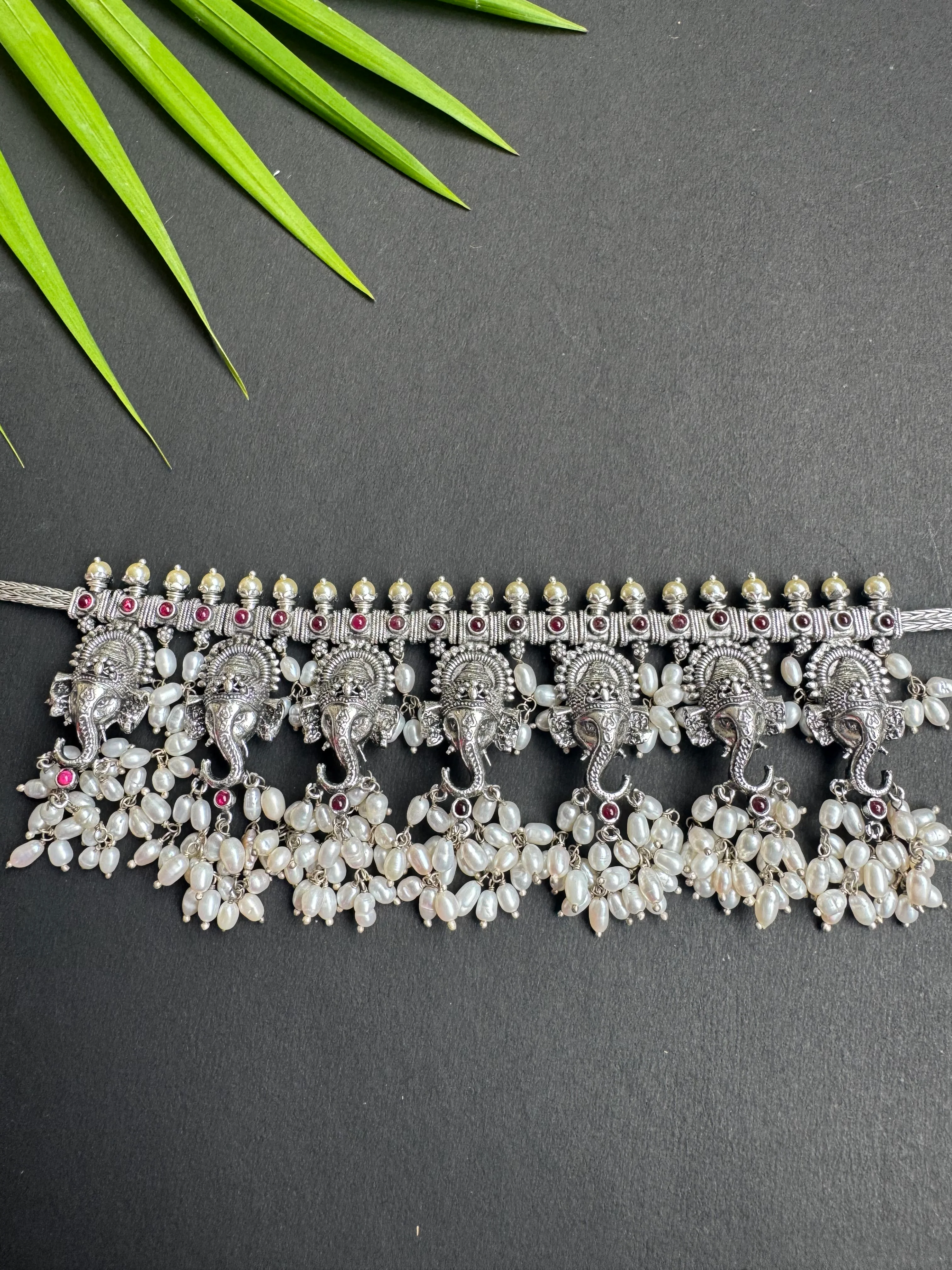 An ornate necklace with the image of Ganesha surrounded by intricate detailing and decorated with beautiful Pearls. The entire piece is crafted in pure Sterling Silver (92.5%) and oxidised . This necklace ia available in gold-finish on request.
