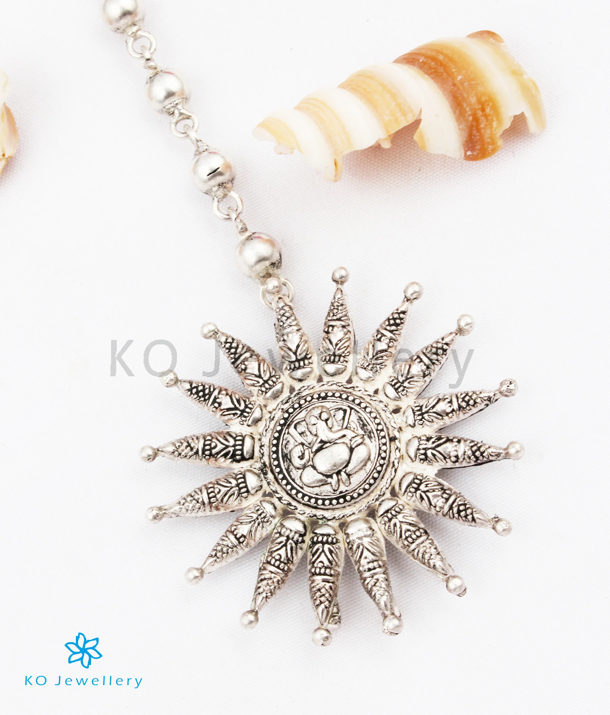 Make a unique fashion statement with this `maang tikka' which has the image of Ganesha in the center.Crafted using techniques used in ancient South Indian antique gold temple jewellery the entire piece is crafted in pure silver and oxidised.