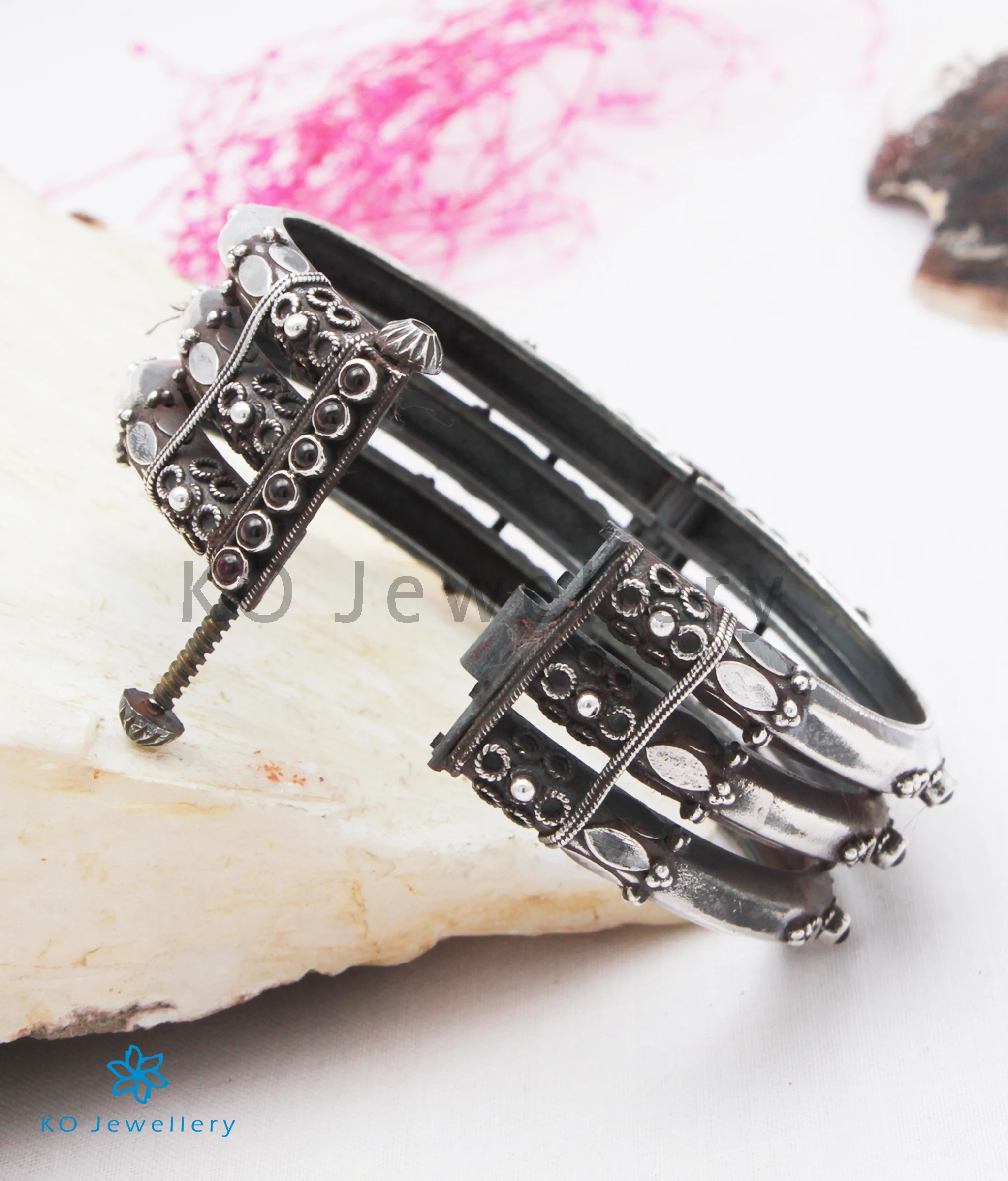 Intricate detailing and tiny kempu stones make this bracelet an irresistable accessory. This design is a staple of Kodava traditional jewellery. Handcrafted with care in Sterling Silver (92.5%) using techniques used in ancient South Indian antique jewellery the bracelet is oxidised in a special process to give an antique look. This is a kada with a screw that can be opened.