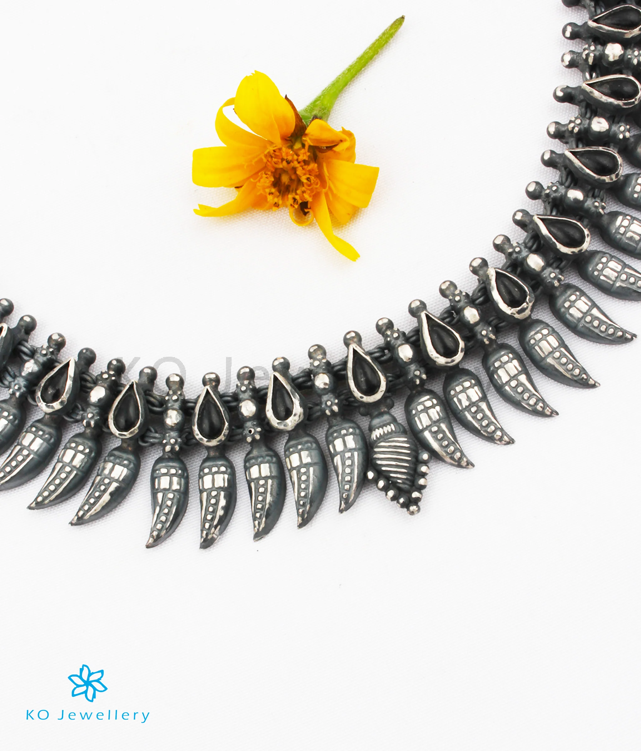 (Note: This necklace can be bought alone or along with the jhumkas, prices for both are different and both options given. Tassle provided at the end for adjusting the length, we can also provide silver links/chain if desired at an extra cost. This is a short necklace that sits close to the neck)