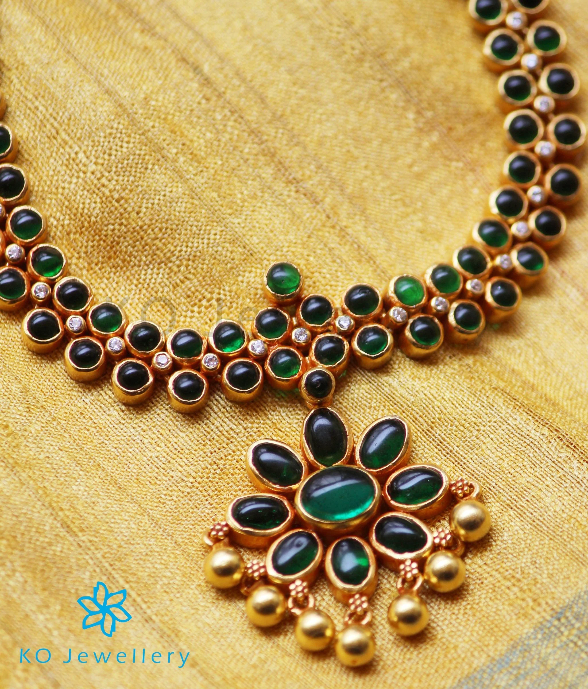 A classic design of south Indian temple jewellery this necklace has two rows of green kempu stones interspersed by tiny white stones. Called an `Addige' this necklace is crafted in Sterling Silver (92.5%) using techniques used in ancient South Indian antique gold temple jewellery.