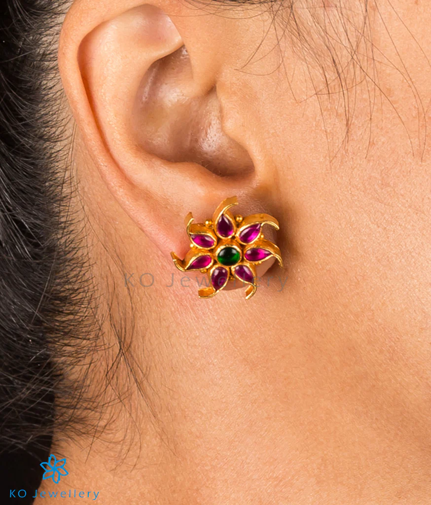 A pretty pair of floral design gold-dipped sterling silverĀ (92.5%)Ā ear-studs handcrafted to perfection and decorated with kempu stones.