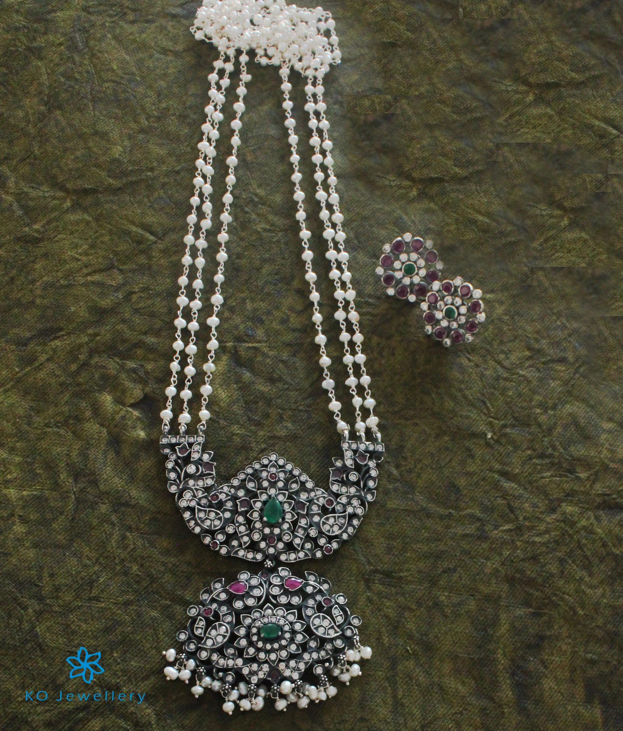 A stunning kempu stone necklace in oxidised Sterling Silver (92.5) ; this necklace uses the `Makarakanti' design - a ceremonial necklace worn by kings in ancient times. The pendant has two peacocks etched in fine detail facing each other, while the necklace string is made up of three lines of natural pearl handwoven in silver wire. It is paired with matching earstuds.