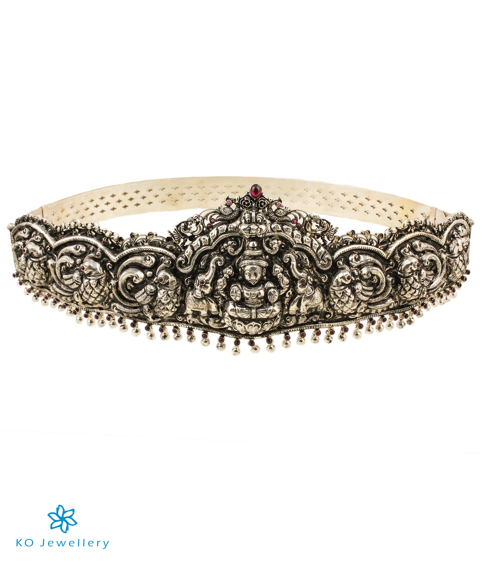 Spectacular and ornate this bridal waist belt is handcrafted in a traditional design in Sterling Silver (92.5%). It has a central goddess Lakshmi pendant flanked by two elephants and surrounded with pretty peacocks.The sheer intricacies of design and flawless craftsmanship make this waist belt handcrafted using the ancient nakkasi technique special.